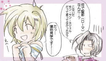 | ―――――――――――――――――――――…・・・† †着いたかな?これからの地図† ―pm9:35(イタリア時間)ローマ・レオナルド・ダビンチ空港着。税関後、バスに乗る(小さい)。……運転荒いよ!!夜の町並み、城壁にいきなり感動。『ホテルビクトリア・ローマ』に11時頃着。 ―BAR(バール)に行く。何がなにやらわかんないのでコーラ注文。何故か「こんばんは〜」と声を掛けられた…おおうっ、折角イタ語で言おうと思ったのに。 ええと、値段はL12000。日本円にして840円(2本)。 Es:うわあ…見晴らしがいいですう…。 ―そう、すごく見晴らしいいです。 ちなみにベッドよく見たらダブルじゃなかったよ(笑)。 ―と言うわけで明日の予定。パンテオン周辺!!……1:30です。早く寝ろ。 次の日へ |