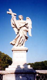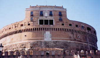 | 大天使ミカエルがこの地に降り立ち、当時流行していたペストを鎮めた。 そんなお話が残る場所です(ガイドブック談)。 お城といっても、要塞に使われていたりなんだりで結構シンプルです。 暫く中庭(芝生)でぼーっとする。その間にこの城は何?って言うことをお勉強。 お城の中に入って…なんだか息苦しくなりそうな廊下を通る(窓がなくて、けっこうな坂で…要塞って感じです)。上に出ると戦いに使った大砲、……そして憩いの場バールがあります(笑)。ここから見えるローマ市内がステキです。 |