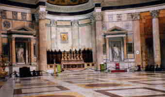 | †パンテオン† ―何度か起きたりして、6時頃、起床。ヒマなので「じゃ、あたりを散歩してくる」とホテルから出る。あやしい日本人カメラマン(謎)かりな。犬を連れたおばちゃんに犬を触らせてもらう。もちろん挨拶を忘れずに「チャオ〜♪」(やあっ。ってか?) 警察官発見。「ポリスマン?」とか何とか聞いて記念撮影(おい)。ノリのいいお兄さんだった。ご協力多謝。 ―朝ごはんは普通にパンとか。スクランブルエッグはおいしかった。 ―んでは、タクシーでGO。 ローマ第1日目はパンテオン!! Es:つきました♪ Ro:………ふうん。で?何の建物なんだ? Es:ええと、『全ての神々を祭ったところ』と書いてあります。 ―ロクスの背景(エクレシア)スチルの一枚(多分)。世界遺産登録。私的には外見だけ見られれば良かったんだけど…前言撤回。いやあすごい!キレイです!!初日にしてやはり感動。36枚フィルムがいきなり終わりました。 そこにいた人(↓)がどうやら名前と出身を書いていけと言っているらしい。ありがたく本名と「JAPAN」と書いてきました。そのページには他に日本人の名前はなかったなあ。 |