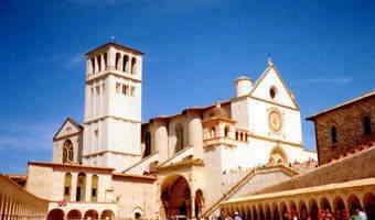 | 11時頃、アッシジ着。→はバスから撮ったアッシジの様子…。うっ、ブレてる(汗)。これでも頑張って(後ろの席を陣取って)撮ったのに〜。詳しくはここ。 これが見たくてアッシジ付のツアーを選んだといっても過言では…。ちなみに教会ですね。 そしてやってきました、サンフランチェスコ教会。 イタリアの守護聖人フランチェスコを奉ってあります。…写真撮影不可なので内容はお見せできないのですが…、壁一面のフレスコ画は見事。彼の人生を描いた〜というものです。昔の人、文字が読めなかったからね(ガイドさん・談)。 アッシジはただいま修復中。1997年に地震が起きた為。2002年には工事が終わるようです。町全体が世界遺産に登録されました。またクレーンがなくなったらまた来てくださいね、とは現地ガイドさん・談。 |
