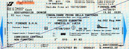 | 昨日、ごたごたしながら買ったフィレンツェからヴェネツィアまでの新幹線のチケット。 本日、祭日。聖母被昇天祭。…きっとフィレンツェやローマは巡礼者でごった返すだろう。 TVの言っている意味は分からないけど、ヴァチカンの様子が流れていた。 8:38のES(ユーロスターという新幹線)に乗るべく、朝ごはんを7:11に食べる。 SMN駅(中央駅)へ。 ↑これがそのチケット。実物は結構大きいしもっと長い。よく見ると8:38発や、フィレンツェからヴェネツィア(サンタ・ルチア駅)って書いてあるよね。行く方、参考にしてください。 ちゃんと電車に乗る前に刻印機に入れましょう。席は2等・10号車の81.82。指定席。 よくあることだが、電車、遅れやがった!!しかも番線が変わるらしい。駅名などの単語しか聞き取れず、地元の人に聞いたりする。ああ、でも不安だ!と思ったら…。 …あれ?あの人見たことあるよ! なんと言う偶然か、ローマに行くときにミラノでお世話になった、どっかの添乗員さんに会う。速攻、チケットの読み方と電車の番線を確認、彼らもヴェネツィアに行くらしい。偶然ってあるんだなあ。偶然って素晴らしい! |