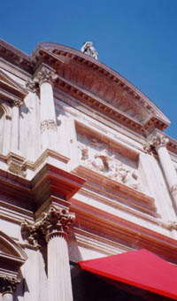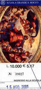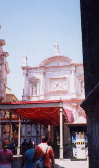 11時、ヴェネツィア着。流石祭日。巡礼者らしい人や、観光客ばっかり。 とにかく歩く。てくてくてく。迷わないといいなあ。 今日ヴェネツィアまで旅に出てきたのはサン・ロッコのため。 フェバ資料集、ロクスの名前の由来に『ルネッサンス期に描かれた絵の聖人――』…。せっかくイタリアまで来たんだから。ね?(聞くな) スクォーラ・ディ・サン・ロッコ(Scuolaとは聖職者ではない者達の信徒会で、ある守護聖人を立てる)ヴェネツィアではサン・ロッコの規模は大きい。……というのは教会内に置いてある説明書きから。預言者の絵とかあったりして「預言者〜〜!!」と心の中で叫んでみたり(笑)。 聖ロクス(イタリア読みはロッコ)は、疫病の守護聖人。明日が(16日)記念日の為、いろいろ飾ってあった(赤い天幕とか)。 明日の祭り(?)に先駆け、ポスターなどが貼ってある。パンフを貰ったが!!読めない…まあ、記念か。 入場料はL10000。なんだかいろいろ表記してあったけどあれはなんだったんだ??安いのはL3000だった(汗)。 う〜ん、サン・ロッコ教会ってのはないのかなあ…?これはガイドブックにも載ってない。現地で買ったガイドにも載ってない…。でも…あれ?スクオーラの中で貰った用紙には建物が余分に載って……。目の前の建物がそれ(教会)だ(笑)。早速向かう。 |