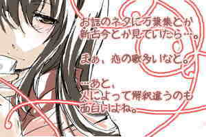 …つか、あれって元の歌も嫌味に近かったと勝手に思っていたよ(深読みしすぎか?(笑))。 まぁ、本人たちが分かればいいんじゃないでしょうか。こんなどうでもいいウンチクをあとで小説のあとがきにでも書く…かもしれません(オイ)