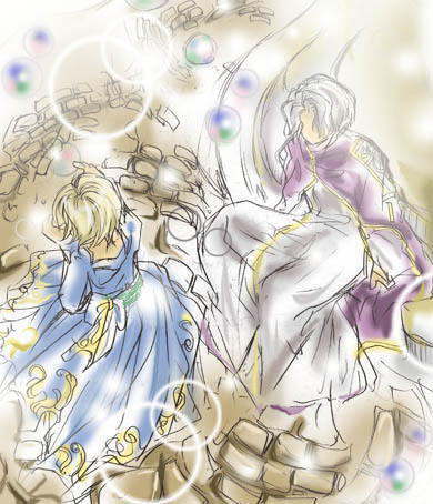 『小さい光』挿絵。遠近感…?そんなの無視してください(爆)。 石畳ってすごく好きなんだけど描くのって難しい。しかもこんな色じゃないって。 ロクス…どこ座ってるんだろう。階段にしては曲線すぎや…。ガウディ好きなんだ(関係あるのか…?)。