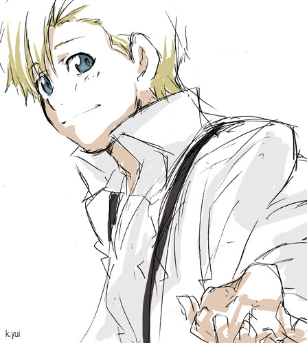 お手を…どうぞ?的な(何)。 ウソウソ、手をつないで行こう!みたいな。 ラフ描きそのままなので線の修正してませ……あああああ〜(笑)。 2010.03.17 お題 『ハガレン32題』へ ハガレンギャラリーへ