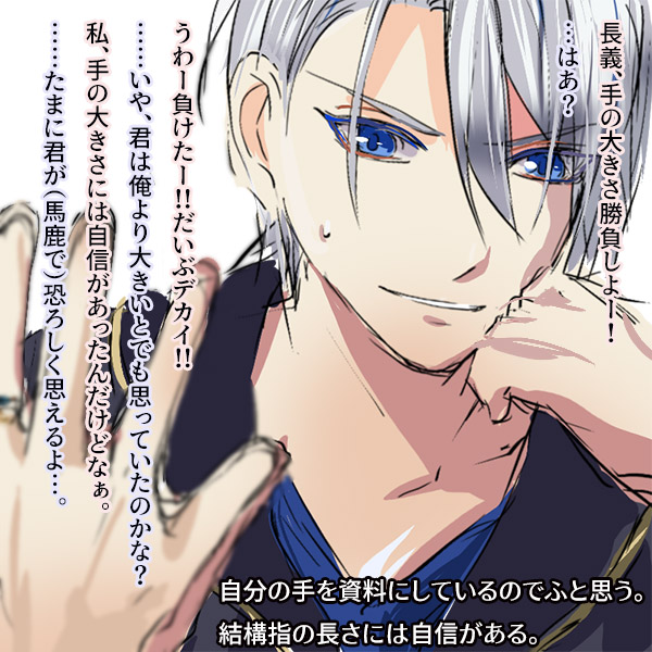 | こういう呆れる顔が好き。 | 手の大きさを比べる。 …私結構指は長い方なんですが、多分長義…というか刀剣男士は手がでかそうだ。 |