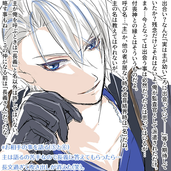 | 何のことはない落書き | いいねの数だけ相手の事を語る 私は苦手なので長義に答えてもらっていた |