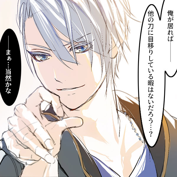 | 何のことはない落書き | 明るさとかやりたかった。付き合ってくれる近侍 散策するくらいの時もこんな試すような薄ら笑いしてるんだよこの刀 なんなの(笑)好きなんだけど…! |