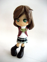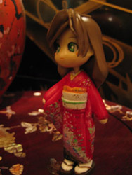 | (左):振袖サエナ。 こちらも色なしのなつやすみの宿題。 振袖の資料をカタログ出してきて研究(笑)。ネイルアートのシールは全くいいモノがなかったので仕方ないと全部塗りましたよ…。はう。 現物は大変な事になっているので見ないほうがいいでしょう。 (右):新パーツ。後ろに手を回しているような構図です〜。こちらの黒スカートは結賀が元々持っていたやつ。レースつけてます。 |