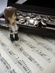 | (左)フルートと一緒。 譜面は有名なやつなので、分かる人は分かる筈。楽器が背景というのは良いですな。 特に管楽器の場合、光るからなー。写真写りはとてもよいと思いますがどうでしょうか? (右)スカート変更ー。 フリル大好き。 当時の情勢からして…こんなにころころ服が変わっていいのか不明(笑)。 |