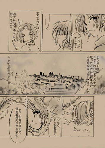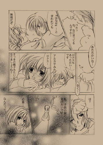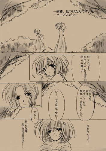 未来の約束 明るい陽射しがまぶしい。 こうしてのんびりと外を歩くこともひさしぶりだった。 以前の自分だったら、こんなにおしこめられ、仕事を押し付けられたならばすぐに逃げていただろうが、今はそうはいかなかった。 副教皇に加え、口うるさいのが一人増えたから。 それを心地よく感じる自分に少し笑いながらすごす毎日がすぎていく。 混乱の中にも復興のきざしのみえはじめた世界。 口うるさい人物の一人の副教皇から今日一日くらいの骨休めの許可が下り、もう一人の口うるさい人物をつれてどこへ行くともなしに歩いていた。 あいかわらず、わからない言葉で歌を口ずさみながらきょろきょろとあたりを見て歩く。 ロクスはそんな彼女を斜め下に見ながら歩いているとふと、すれ違った親子に目線が止まる。 両親にそれぞれの手をひかれ、時々ぶらさがりながら歩いている少年。 無邪気に笑っているその命を救ったのだと、こういうときに実感する。 しばらくその親子を目でおっていると、ふと右手にぬくもりを感じた。 「なんだ?エスナ」 突然手をつなぎだした彼女にそう聞く。 何も言わずに笑っただけでそのまま歩きだし、歌の続きを口ずさむ。 「変なやつだな」 いつも自分からこういった行動をとらないだけに、首をかしげてしまう。 迷子になるとでも思ったのか。 「いい天気ですね〜」 ようやく歌がくぎりのいいところまで歌ったときには街をぬけ、小さな丘まで歩いてきていた。 ここから聖都が見える。 両親にここにあずけられてから、なんやかんやいってもずっとここで育ってきた。 寝転がると、アルカヤが温かく自分を包み込む。 となりにエスナも腰をおろす気配がして優しく風がゆれる。 「ったく、君も副教皇も人使いが荒すぎるぞ。僕を過労死させる気か?」 のんびりと空をながめながらそう言うと困ったような声が隣でする。 「仕方ないですよ、まだまだ立ち直ったとはいえ、人々が教会に求めているものは多いのですから」 「だからって僕をこきつかう理由にはなってないぞ」 「う〜、それはですね、ロクスしかできないことがたくさんあるからです」 のんびりとした声で答えられる。 ロクスは少し笑って隣で手をついて座って空をみあげているエスナを見た。 「僕にしかできないことと言ったら・・・」 急にぐっとエスナの手を自分のほうにひきよせる。 「きゃっ?!」 突然のことで抵抗もできず、エスナがロクスの上にかぶさるようにのる。 しっかりと腕をエスナの背中にまわした。 「こうして君を抱くことくらいだ」 「な、なに言ってるんですか?!ちょ、ちょっとロクス!」 「はなせ、と言われても無理だぞ」 「も〜!なんでですか!?」 あわてるエスナをしっかり抱きしめる。 「あたたかいな・・・」 「まったくもう・・・」 暴れてもかなわないことを認め、文句を言いながらもエスナは瞳をとじてロクスの胸に自分の頬をあてた。 「まるで・・・アルカヤだな」 背中の地面を温かく感じるように腕の中の少女を温かく感じる。 記憶に残らないくらい遠く感じた両親のぬくもりも、こんなだっただろうか。 「ロクスもあったかいです。アルカヤみたいに・・・」 心地よくエスナの声が耳に届く。 「ロクス・・・。さっきの親子みたいになりましょうね?」 「?」 とっさにエスナがなんのことを言っているかわからなかった。 「私、子供のそばにいてあげたいです。・・・必要なんだって。親子って意味、見つけましょうね・・・」 ああ、そうか。 だから手をにぎってきたのか。 いつか話した自分の事。 両親と離れて暮らした偽善にあふれた教会。 いつかつぶやいていた君のこと。 冷たい天界の宮殿。 それらの中からでも大切なものは、いくつもでてきた。 その中で君を見つけたから。 「エスナ・・・」 少し背中にまわした手に力をこめて。 「それはプロポーズか?」 「!?ち、違います!!」 温かい風が吹きぬける。祝福とはきっとこういうことをいうのだろう。 「故郷、見つけたんです。私」 「?どこだ?」 「ロクスです。ロクスのいる場所が私の故郷です!」 「・・・バカだな、君は。そういうのは故郷って言わないんだ」 「む〜、そうなんですか?でも決めたんです!私の故郷。私の居場所です!」 さやさんから、私のつたないイラストのお礼にいただいてしまいました。 もう、これを初めて読んだとき、泣けてきました〜。エスナがロクスの手握ったとことか、最後の「私の故郷です」とか ロクスがエスナ引き寄せるとことか(笑)〜〜〜全部。 私に出来ない優しい小説ですね、ホントに嬉しいです! 「アルカヤみたいだ」ってすごくいいと思いませんか? しかも口うるさくてプロポーズもどきをしてしまうエスナがいいです。また歌うたってるし。祝福だし。 |