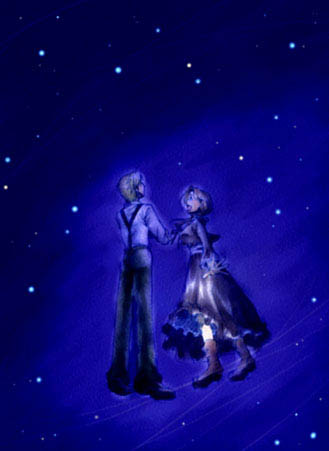 1923年、8月上旬。 その日、アルフォンス・ハイデリヒはとても機嫌が良かった。 「…何、ここっ…?」 サエナが連れてこられた先は工場。 その空気に圧倒され、今言った言葉だって口に手を当てながらだった。 声を発してはいけないような気がして、自分が場違いのような気がして、置いていかれないように思わずアルフォンスの袖を掴む。 「まだ一般公開はされていないんだ、だからぼくらだけなんだけど」 そしてもっと驚かせることを平気で言うアルフォンス。 「ええ!そんなところ来ていいのっ!?」 「だから、特別なの、いいからついといで」 ――――この、話の発端は数日前に遡る。 「プラ……。なんだって?」 「プラネタリウム」 「……ネタリウム」 聞いたことのない言葉にサエナはそのままオウム返し。 「…なんだと思う?きっと気に入ると思うんだよね」 いたずらっ子のような笑い。 「う〜…ん。よし。…――はい!」 「どうぞ」 くすくす笑いながら。 「『なんたら…ウム』っていう名前の金属!」 「…ああ、『アルミニウム』とか?」 「そういうの!」 「ん〜。残念だけど…はずれ」 「えー…」 「アルミニウムとか金属じゃサエナ、見たって楽しくないだろ?」 「…まあ、そうだけど」 「今度の休み、見せてあげるから。楽しみにしていて?」 ――――そして現在。 「これ?」 実はサエナは先程から何か見る度に同じ事を聞いている。 何処かの工場の中。工場の中だから見たことがない物がごろごろしているから仕方ないのだが。 「それは違うよ、ここはまだ工場の中だからね、まだまだ先」 その度にアルフォンスは答えていく。アルフォンスは未だに『プラネタリウムとは何か』とサエナに説明していないのだ。 「じゃあ、ヒントあげるよ。…イタリアっぽく『天球儀』…ローマか何処かに彫像があるって話だけど?」 「地球儀の……空版…?え、もっと分からないよ!」 暗い廊下、階段を歩いて行くと『Eintritt verboten』と紙が貼ってある金属製の重い扉。 「アル!立ち入り禁止ッ!これくらい私だって読めるっ」 「だから、特別なの、ぼくらは」 笑いながらその扉を押し開けた。 『立ち入り禁止』の扉の向こうは屋上。そこに作られた大きなドーム。 アルフォンスは、未だに状況が掴めないでわたわたしているサエナの手を掴んでそのドームの中に入っていく。 いつもの落ち着いたアルフォンスとは違って、はしゃいでいるような感じ。今日は、サエナの方がついていけない。 「うわあ、…もしかして。これ?」 「そう、これ」 初めてアルフォンスが肯定の言葉を出した。 ドームの上を見上げるような姿で椅子が置いてある。 しかもこの中は工場の通路よりかなり暗い。 そして真ん中には妙な…丸いものやらがついている装置。 「上を見る…?」 「そ、上を見なきゃダメなの。さ、座って」 手探りで椅子を探し、つく。 「ハイデリヒ、いいか?」 「ミラーさん。ええ、お願いします」 奥から出てきた人(博士?)はその妙な装置を少し調整し、アルフォンスと短く会話を交わすと、そのまままた奥へと消えていく。 「わ!!真っ暗!」 もっと照明を落とされ思わず言葉が出る。 その隣でまたくすくす笑うアルフォンス。 「笑ったな〜」 「サエナがおかしくて」 ――――ぽ。 ぽつ。 「!?」 「…………へえ」 ドームにぽつぽつと明かりが灯る。 「…??星空…?――――なんで…?」 あっという間に夜空に変貌したドーム。 「これが、『プラネタリウム』さ。昼間でも星空が見える」 隣のアルフォンスの声が優しく響く。 「きれい…」 「――――分かる?あれ」 「どれ?」 「あの星」 「……わかんない」 「…まあ、ぼくもそんなに分からないけど」 「ふふ。なんだぁ」 「これが、ぼくがサエナに見せたかったもの」 「…でも。どうして?公開前なのに」 「うん。ロケットの開発してるって言ったら…。……見せてくれるって」 実際はかなり頼み込んだのだが。 「………」 暗闇に目が慣れたから、アルフォンスの顔がなんとなく見える。 ドームを見上げる碧眼はとても澄んでいて。 「すごい……こんな世界がずっと続いてるところに行くんだね…!」 思わず、視界が歪む。 ぽたぽたと雫が落ちる。 「…うん…」 「やっぱ、すごいよ、アルは」 「…褒めても何も出ないよ?」 「え、今日もらったよ…?……これだって、私が最初なんでしょ」 「うん、――――というか最初で最後。…もう誰も連れて来ない」 涙に気がつき、笑いかけながらそれを拭ってやる。 「あは、嬉しいなぁ…」 「…………」 きゅ。 アルフォンスの手がはしゃいでぱたぱた動いていたサエナの手に触れ、掴む。 「全く、泣いたりはしゃいだり忙しいね」 「……う」 「サエナ。………――――『これ』はホンモノじゃないけど、予行練習」 「…!」 一瞬、隣のアルフォンスを見たが、その空をもっと見たくて直ぐにドームに目を戻す。そのかわり、肩に頭を預け、すり寄った。 暫く黙ってそのまま、『昼間の星空』を眺めて…――――。