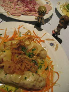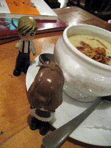 左:ここのスープはめちゃうまい!結構何でもおいしいです〜。三人で写っているやつ、ジャガイモペースト(恐ろしく量が多い)と皮むき白ソーセージのようです。大きいのが2本。皮むきだと焼いてあるのもありますよ。 |