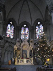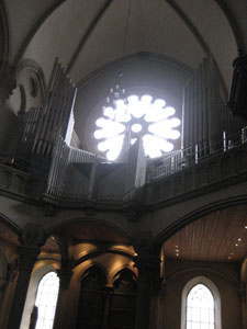 右:ステンドグラスとパイプオルガンです。外からの光がまぶしいですね…!